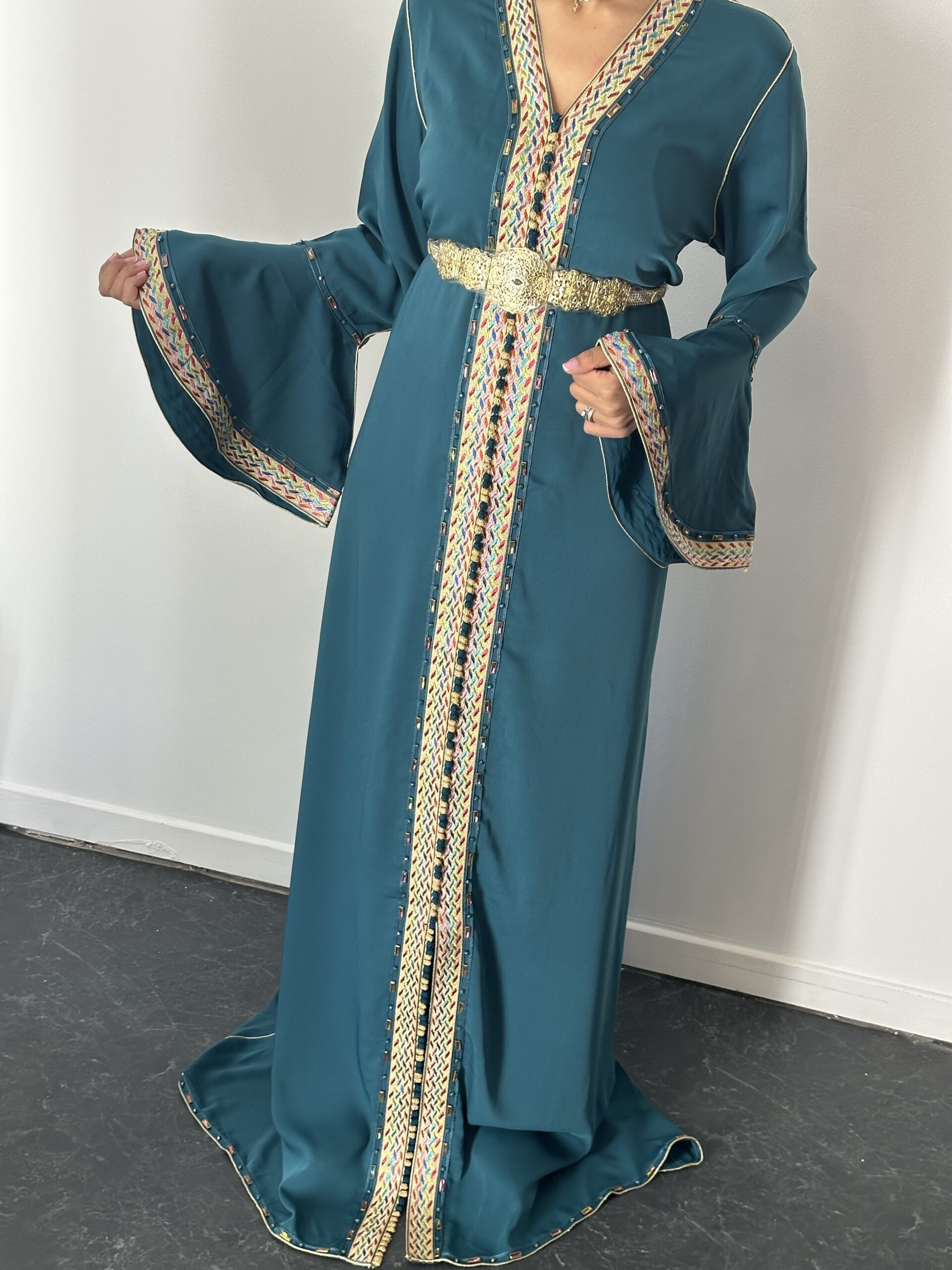 Les broderies qui ornent le Kaftan Alya le long du corps et des manches apportent originalité et festivité, Décliné en plusieurs coloris. cette somptueuse robe marocaine vous un large choix. Chaque fil porte cn lui le récit savoir-fairm* ancestral. transmis de génération en génération, Les broderies desiennent une symphonie de couleurs et la ceinture minutieusement confectionnée ajoute royauté au vêtement. Le Kaftan Alya disponible en fushia, bleu émeraude, bleu ciel, jaune pastel et vert sapin est au prix de 120€ et 133€ avec la ceinture comprise.